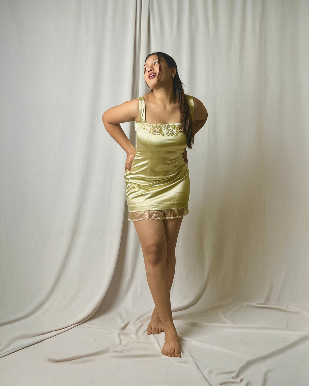 A soft butter yellow satin stretch dress, perfect for summer vacations, sundowners, birthday celebrations, and