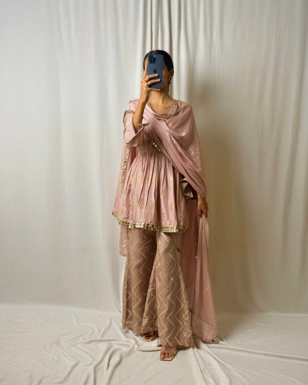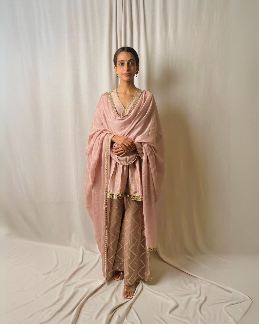 The look is completed with a chiffon dupatta, delicately finished with mirror work along the entire border —
