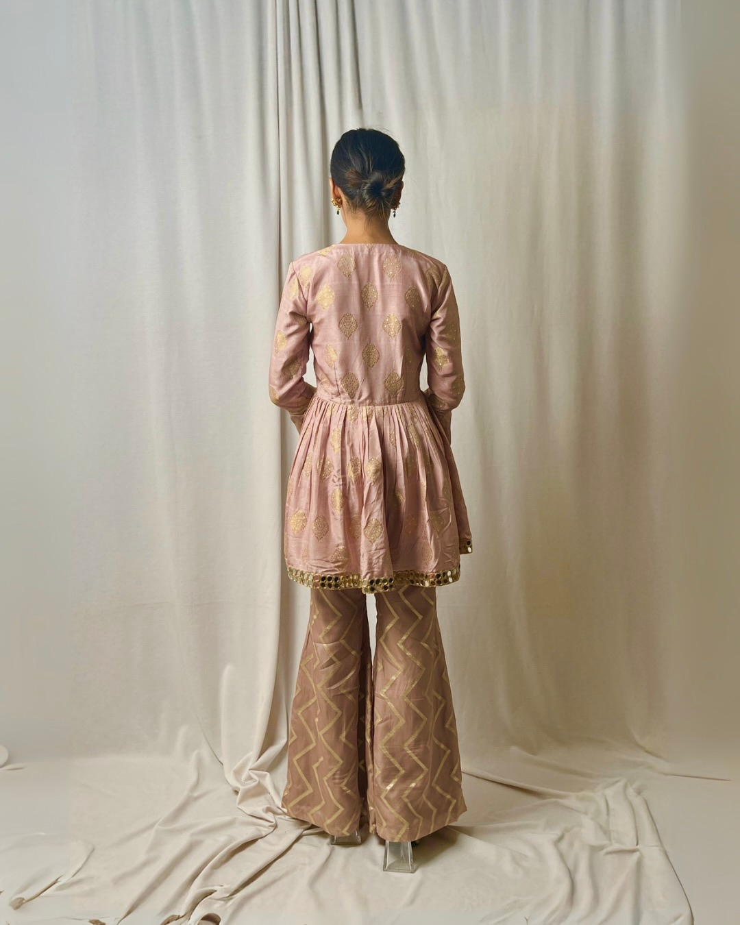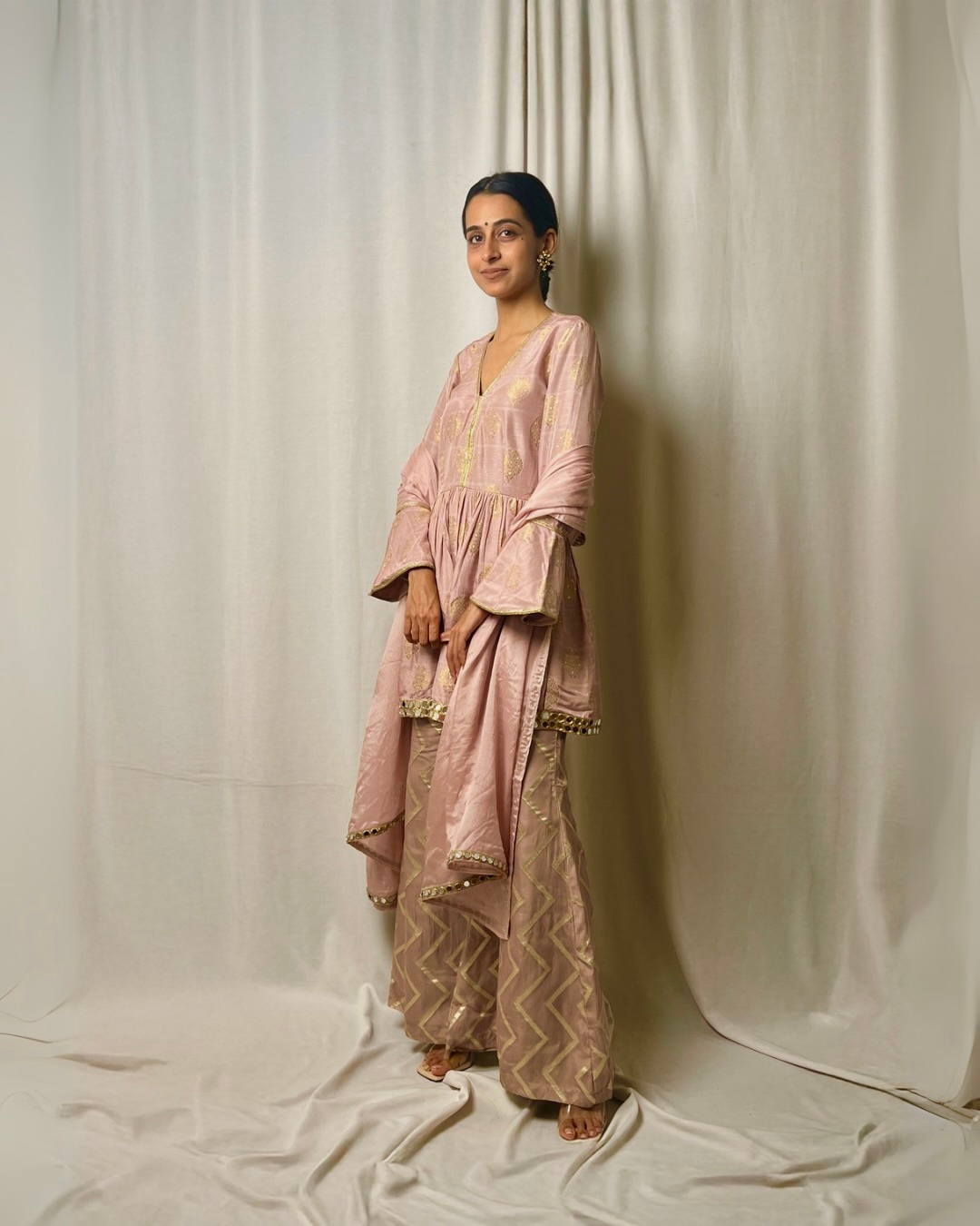 The georgette pants have a slight bell-bottom cut and a soft gold texture that complements the kurta.