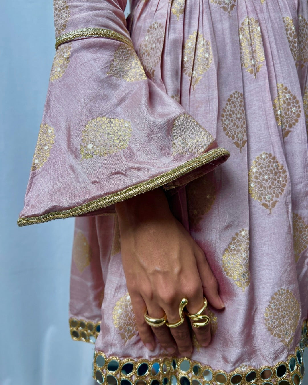 The brocade silk kurta features soft umbrella sleeves, gold detailing, and mirror work along the hem for a