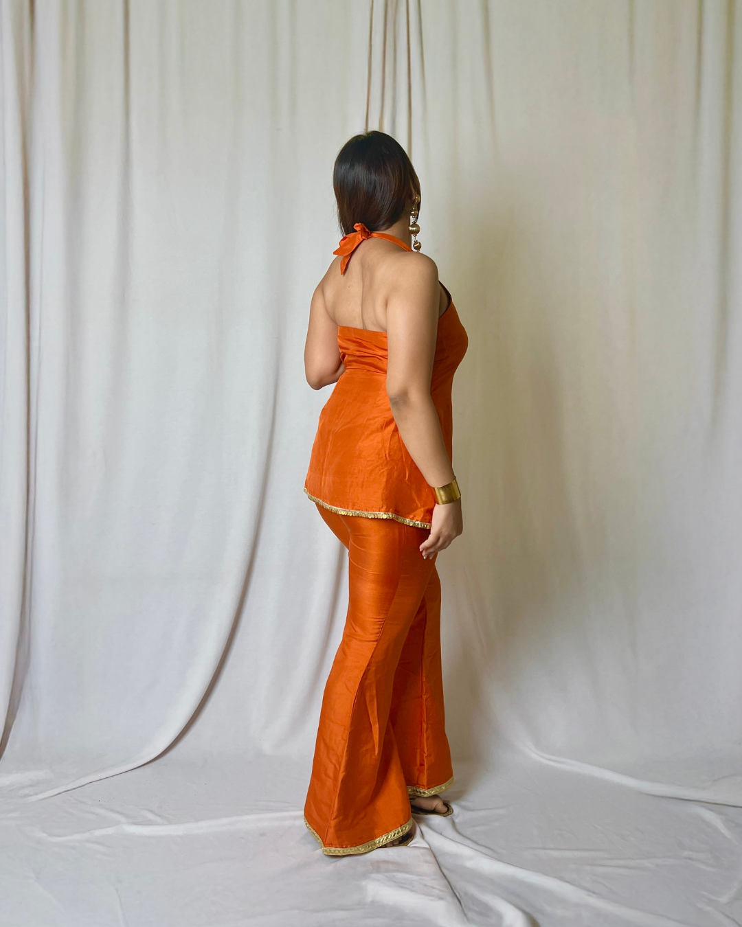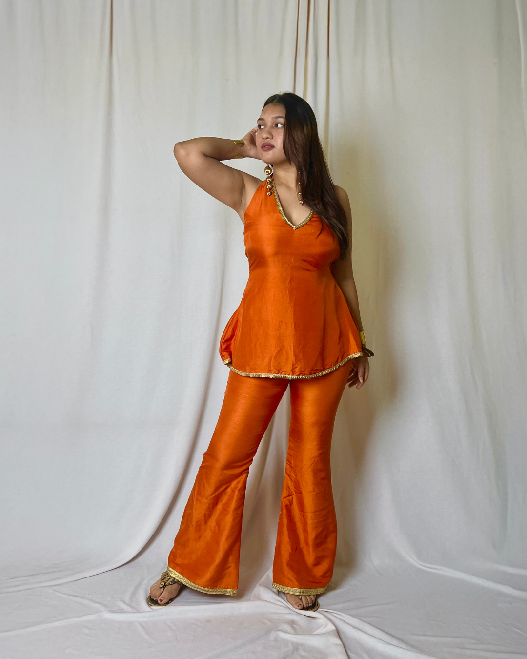 A modern Indo-western set featuring a halter kurta and bell-bottom pants — perfect for festive occasions,